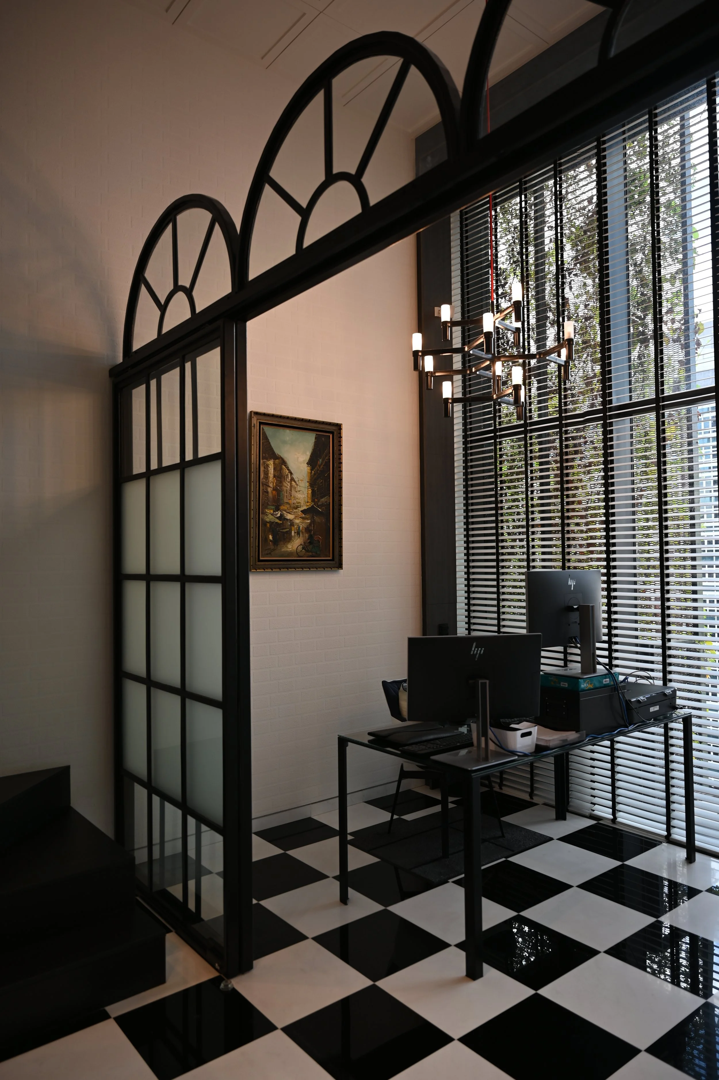Archways and framed sliding doors separate the private office from the general working areas. The archways transposed against the view of the city area behind, forms an interesting contrast between the modern and the classics.